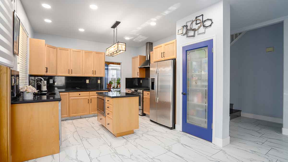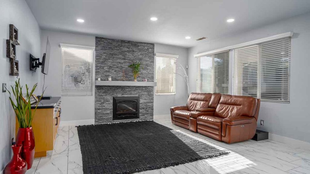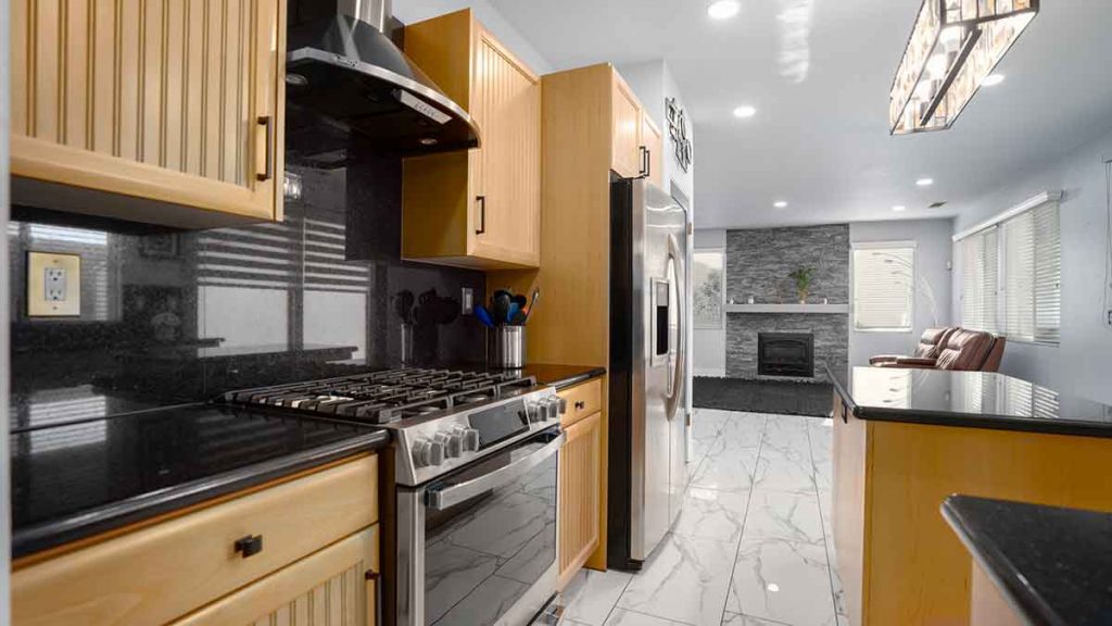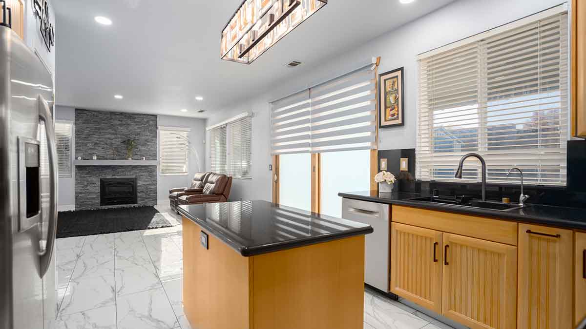 Convenience meets flexibility with two bedrooms and a full bathroom downstairs, perfect for guests or home offices. The recently updated kitchen is a chef's dream, featuring custom cabinets, marble counters, stainless steel appliances, and a convenient gas stove, the microwave is located inside the island. New window coverings in the kitchen and family room add a touch of style and privacy. The family room, with its new fireplace, creates a cozy ambiance for cherished evenings.